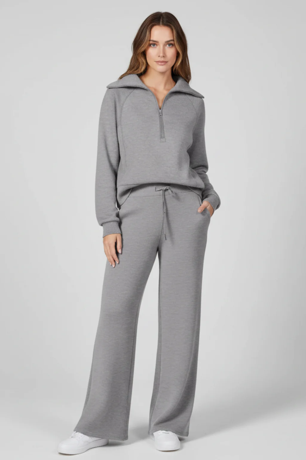 Relax in understated elegance with this minimalist lounge ensemble, pairing a zip-accent top with wide-leg pants for effortless sophistication. The lightweight, fluid fabric drapes comfortably while offering freedom of movement. Designed for downtime or casual outings, it brings a cohesive, polished touch to your relaxed moments.